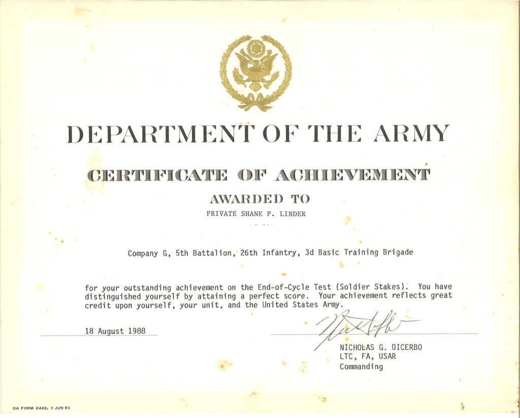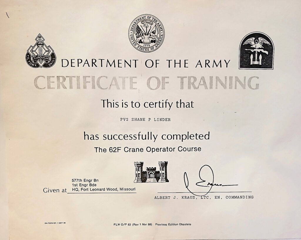 Shane joined the Army National Guard while still in high school and went to basic training between his junior and senior year. Shane was trained as a crane operator and assigned to a bridge building unit. Shane volunteered for an active duty tour in Panama shortly after Operation Just Cause. During that tour of duty, he was deep in the interior jungle in Panama.